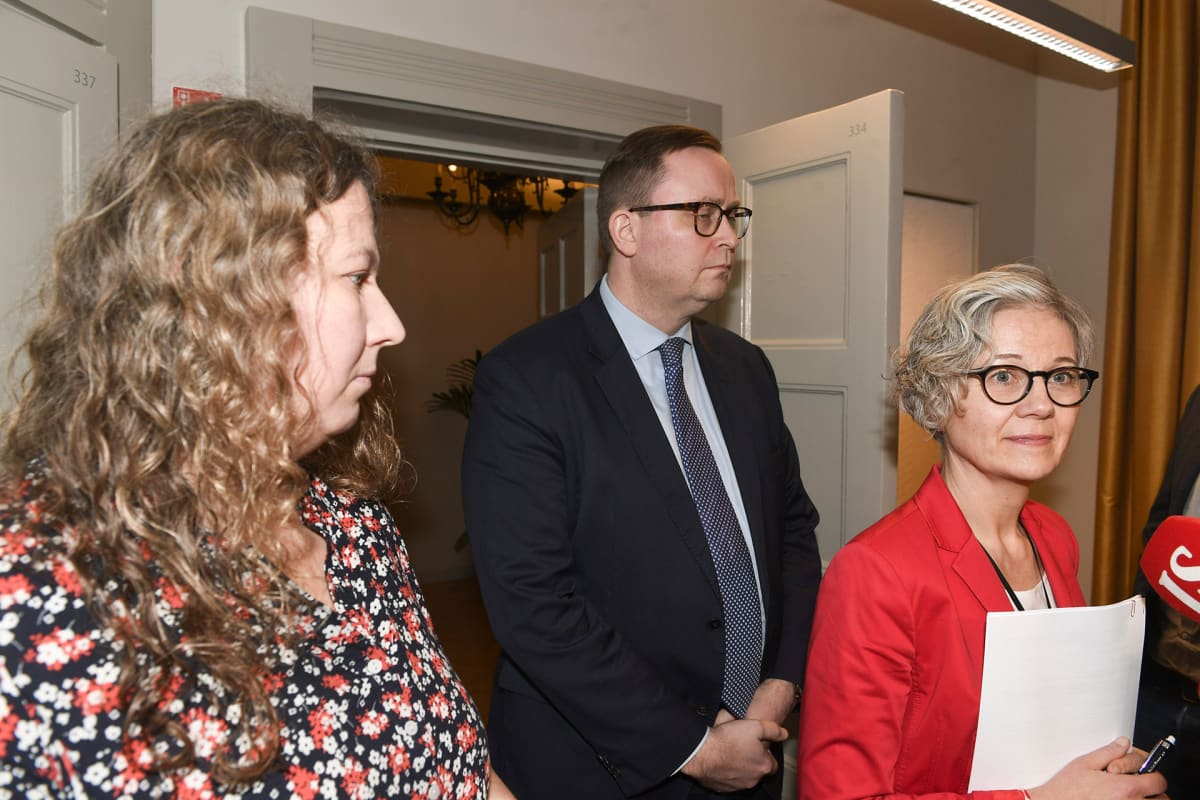 Palvelualojen työnantaja Palta ry:n toimitusjohtaja Tuomas Aarto ja Posti- ja logistiikka-alan unioni PAU:n puheenjohtaja Heidi Nieminen valtakunnansovittelija Vuokko Piekkalan toimistolla Helsingissä tiistai-ilatana.